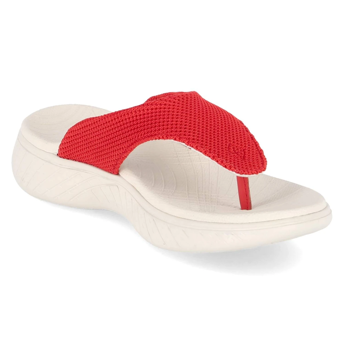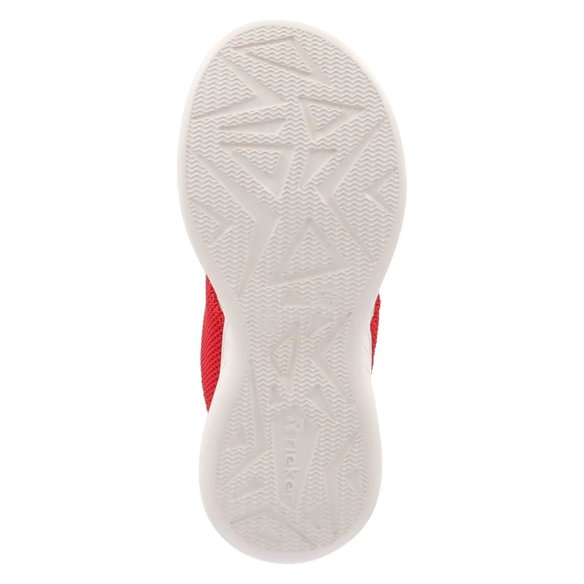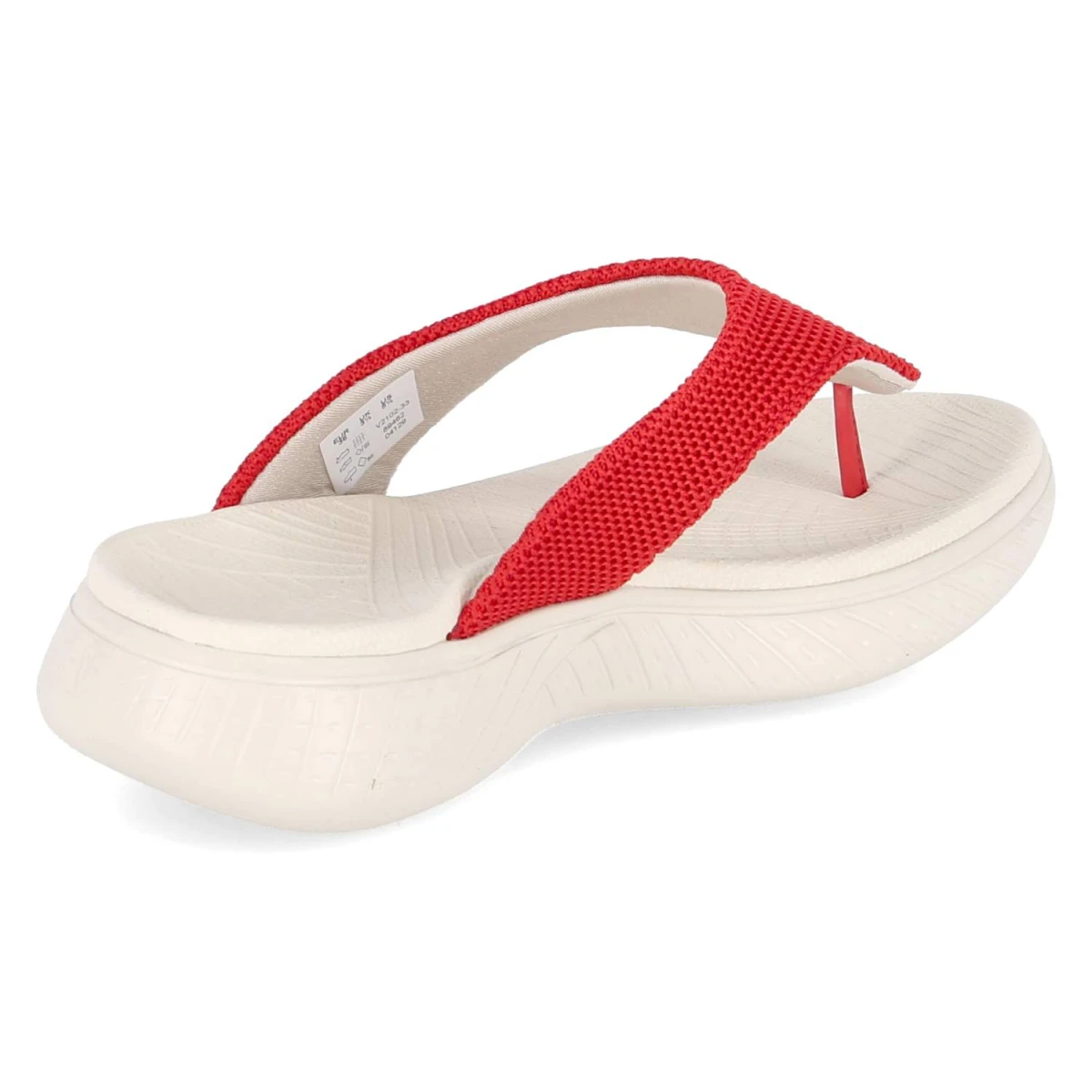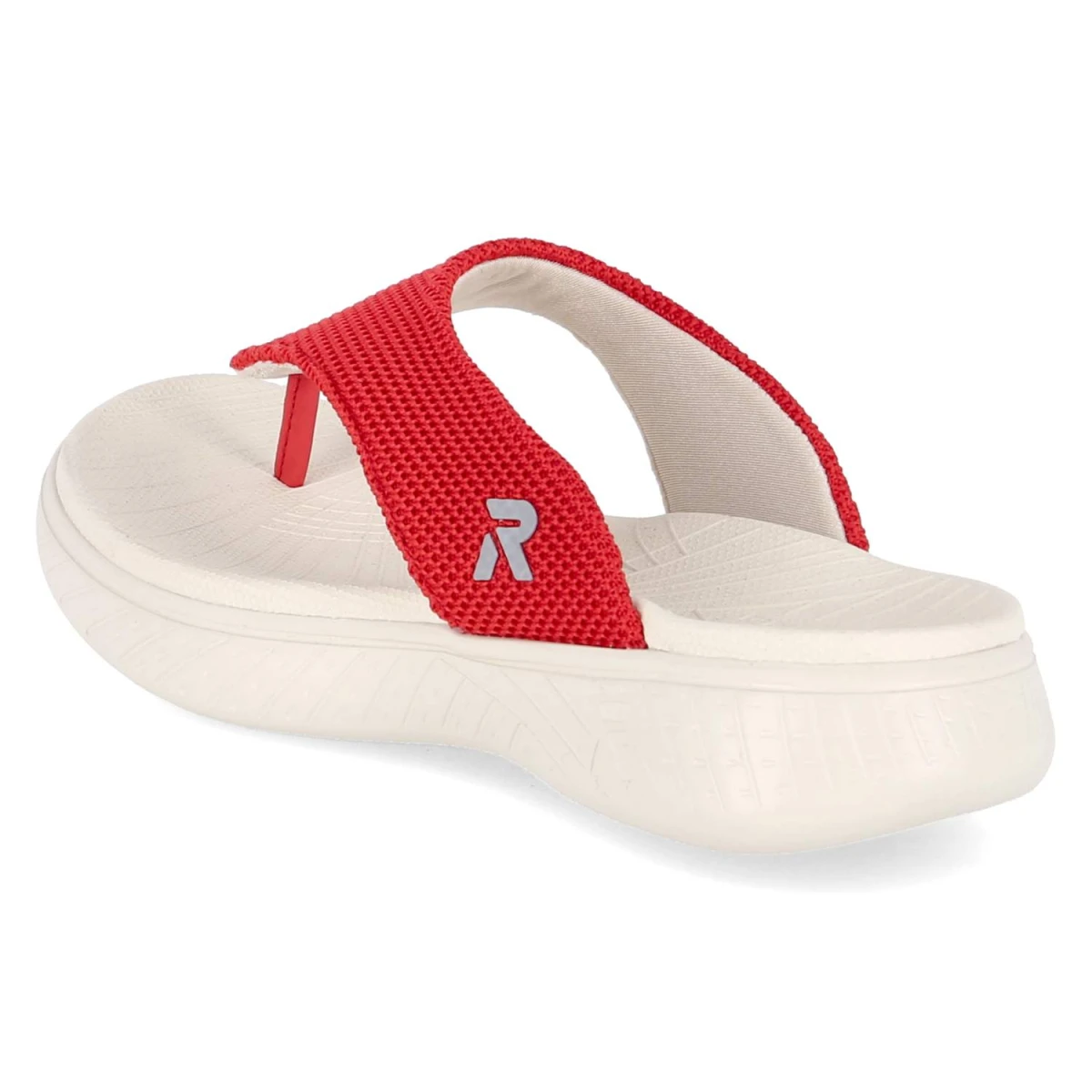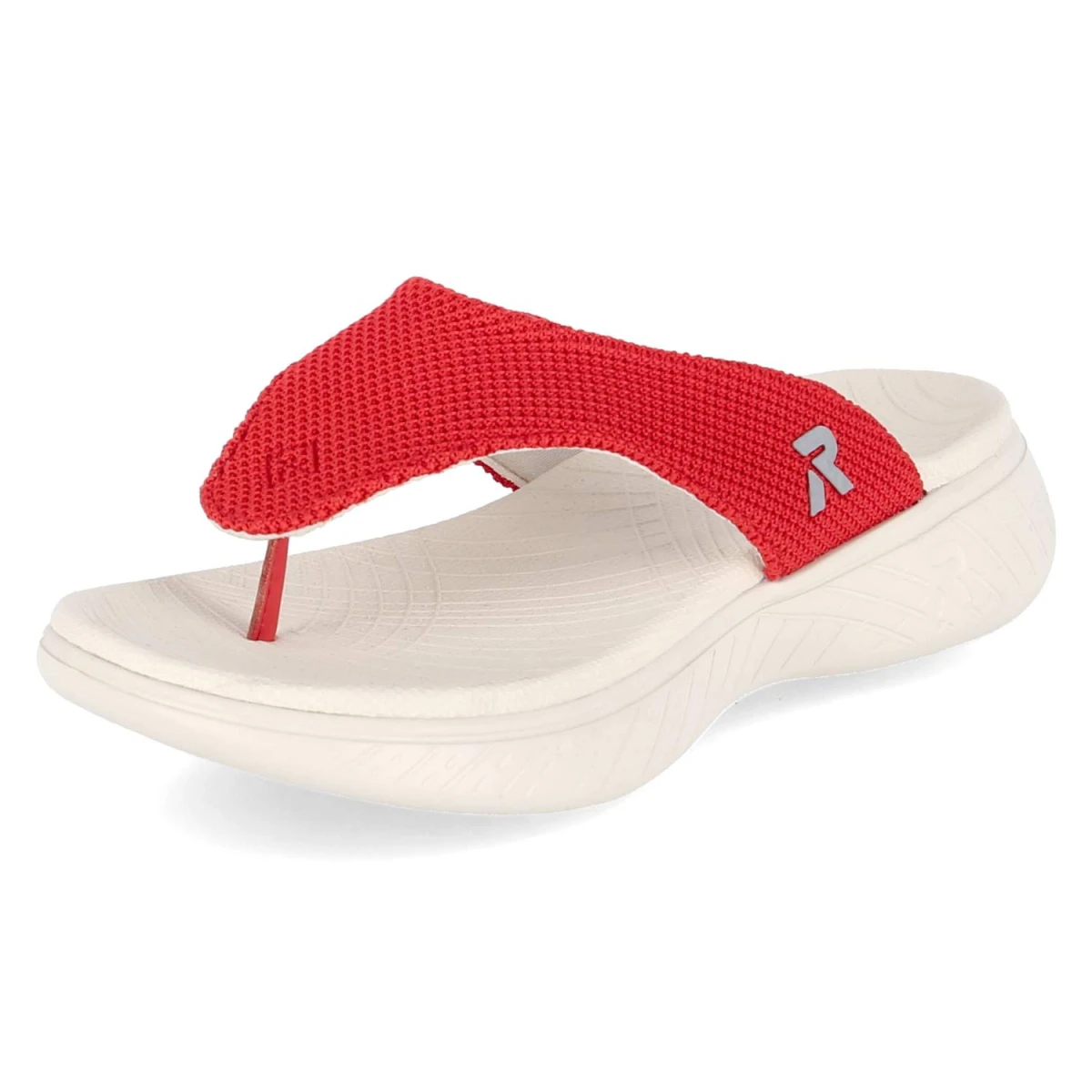 Der Rieker Zehentrenner in kräftigem Rot setzt auf eine gelungene Balance aus Sportlichkeit und Komfort. Das leichte, luftige Textilobermaterial in Strick-Optik sorgt für angenehme Luftzirkulation, während die weiche synthetische Decksohle den Fuß sanft bettet und längeres Gehen entspannt gestaltet. Das offene, schnörkellose Design ohne Verschluss macht den Einstieg mühelos und hebt die lässige Note hervor. Dank des geringen Gewichts bleibt der Schritt agil, ob beim Bummel an der Uferpromenade oder auf dem Weg zum Lieblingscafé. Ein reflektierendes, seitliches Logo verleiht dem minimalistischen Aufbau ein sportives Finish und ist ein subtiler Blickfang bei diffusem Licht. Die Passform fällt normal aus und eignet sich verlässlich für erwachsene Damen. Die Kombination aus klaren Linien und funktionalen Details macht dieses Modell zum unkomplizierten Sommerbegleiter. Modetipp: Ein harmonischer Look entsteht mit gestreiftem Jersey-Midikleid und Denim-Truckerjacke; filigraner Schmuck setzt feminine Akzente.